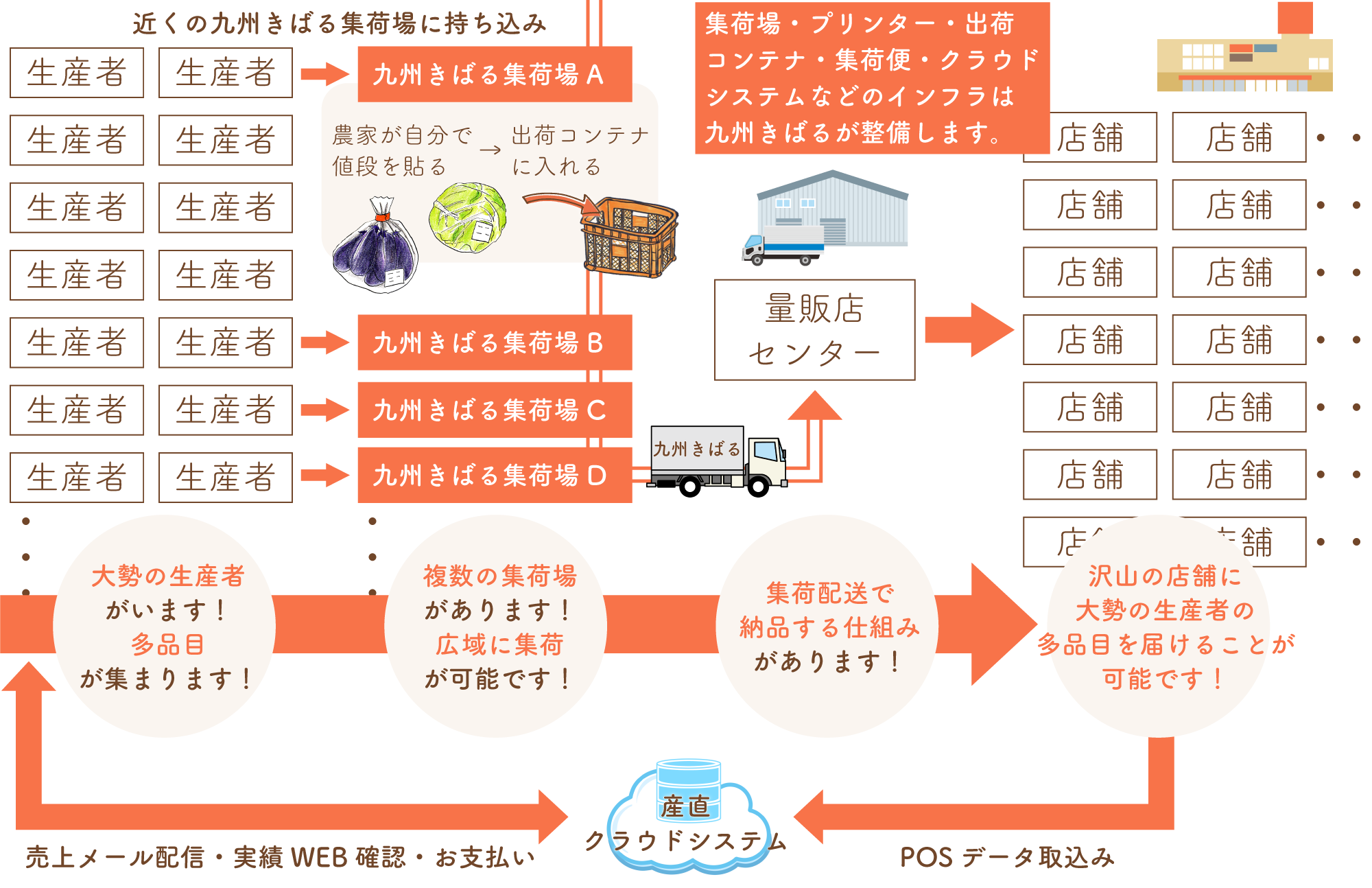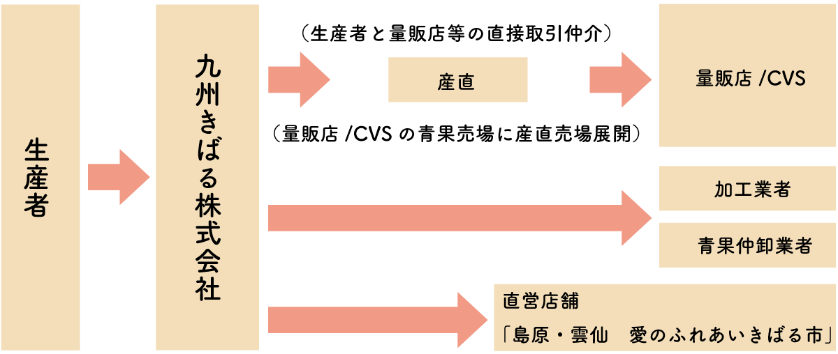 私達、九州きばる株式会社では「生産者」と「量販店」や「加工業者」、「青果仲卸売業者」の仲介役として活躍しております。